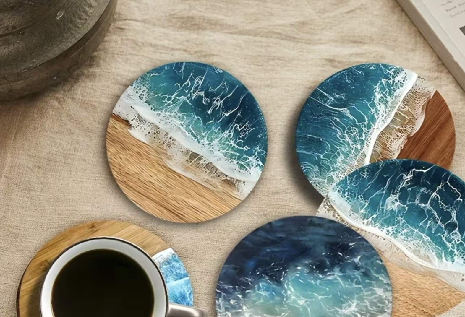Each piece is created using professional-grade resin and pigments on premium wood surfaces, resulting in a finished, high-gloss artwork that captures the movement and beauty of the ocean.